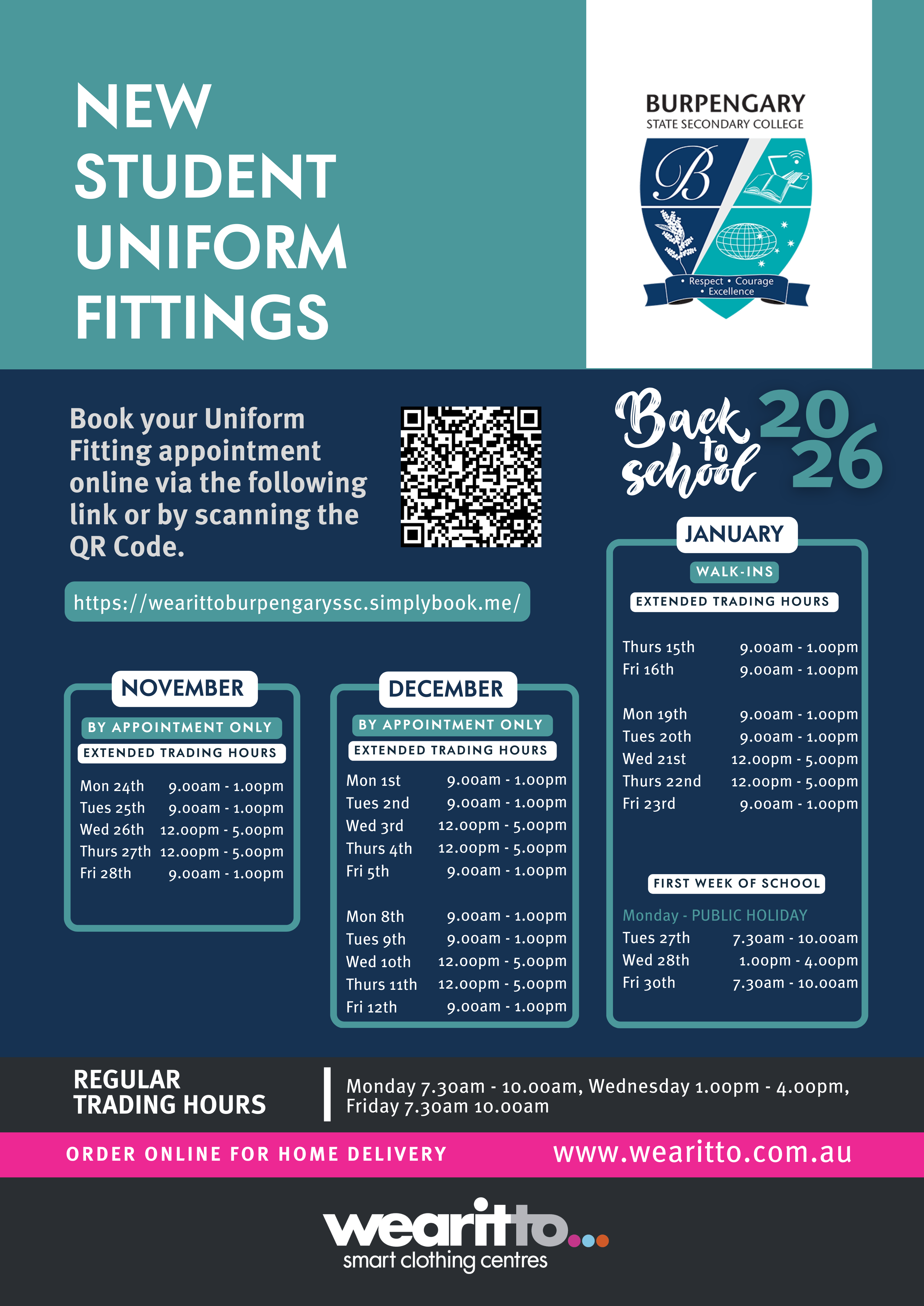 Being a part of the Wearitto school network provides our students and parents with innovative retailing options, including convenient retail shop hours, high quality garment production and fitting services combined with online purchasing. So when you're short on time you can outfit your child at